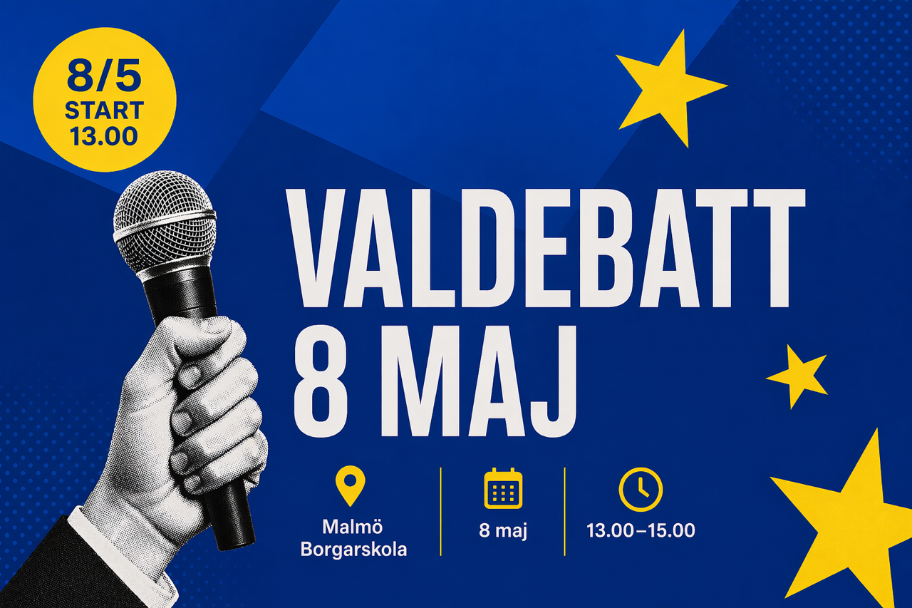 I samband med Europadagen bjuder Europa Direkt-kontoren i Skåne in till en stor valdebatt på Malmö Borgarskola. Här möts politiker från samtliga riksdagspartier för att diskutera aktuella EU-frågor inför höstens nationella val. Debatten är en viktig del av valupptrappningen, där även Sveriges representanter i ministerrådet påverkas av valresultatet. Kom och möt riksdagsledamöter ur EU-nämnden och lyft frågor som är viktiga för dig!